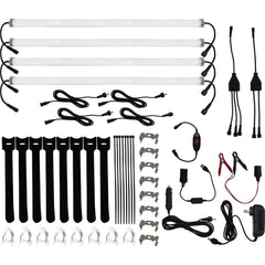 (8) Universal Canopy Clips: Allows lights to be compatible with/attach to all E-Z UP? Instant Shelters; (1) Convenient Carry Bag; (1) Touch Activated On/Off Switch; (1) USB Adapter; (3) 8FT Extension Cables; (1) 4 FT Extension Cable Connectors: (1) 4-Way Connector- Allows all 4 Lights to be Connected Via a Center Hub; (1) 12V Accessory Plug (Car Socket Adapter); (8) Zip Ties; (8) Cable Ties; (8) Screw Mount Clips; (1) 120V Plug; (1) 12V Battery Clamp; (4) Super Bright LED Light Bars; (1) 2-Way Connector